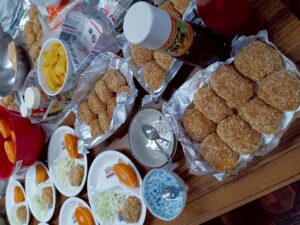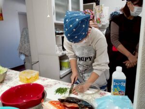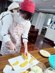 3名の学生がボランティアとして参加しました。当日のメニューは「ボチャコロッケ」と「じゃがいもとしめじの豚汁」慣れた手つきで調理を進め、配膳しながら訪れた子どもたちと楽しく交流しました。